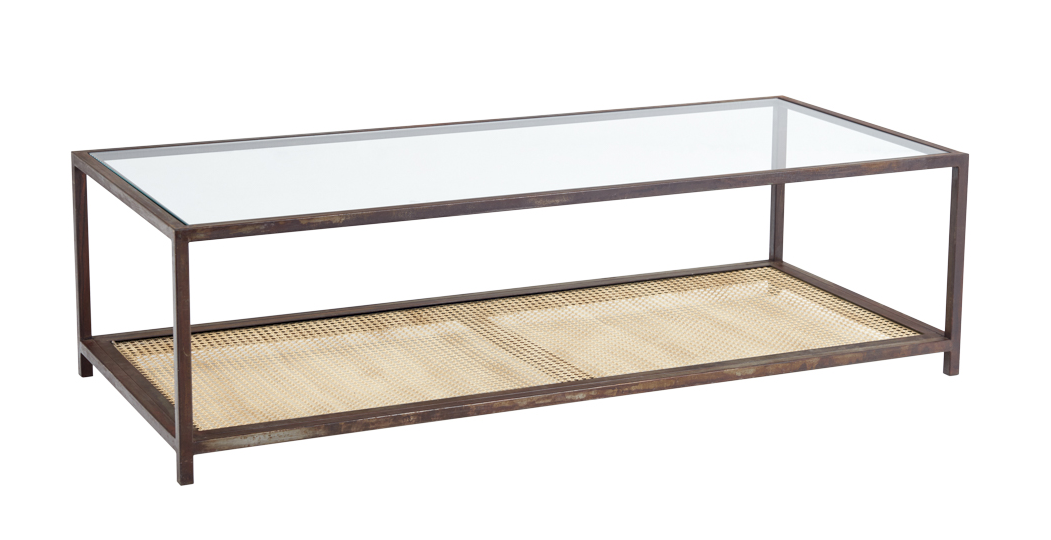 Mesa de centro de ferro envelhecido, com tampo de vidro e parte inferior em palhinha.