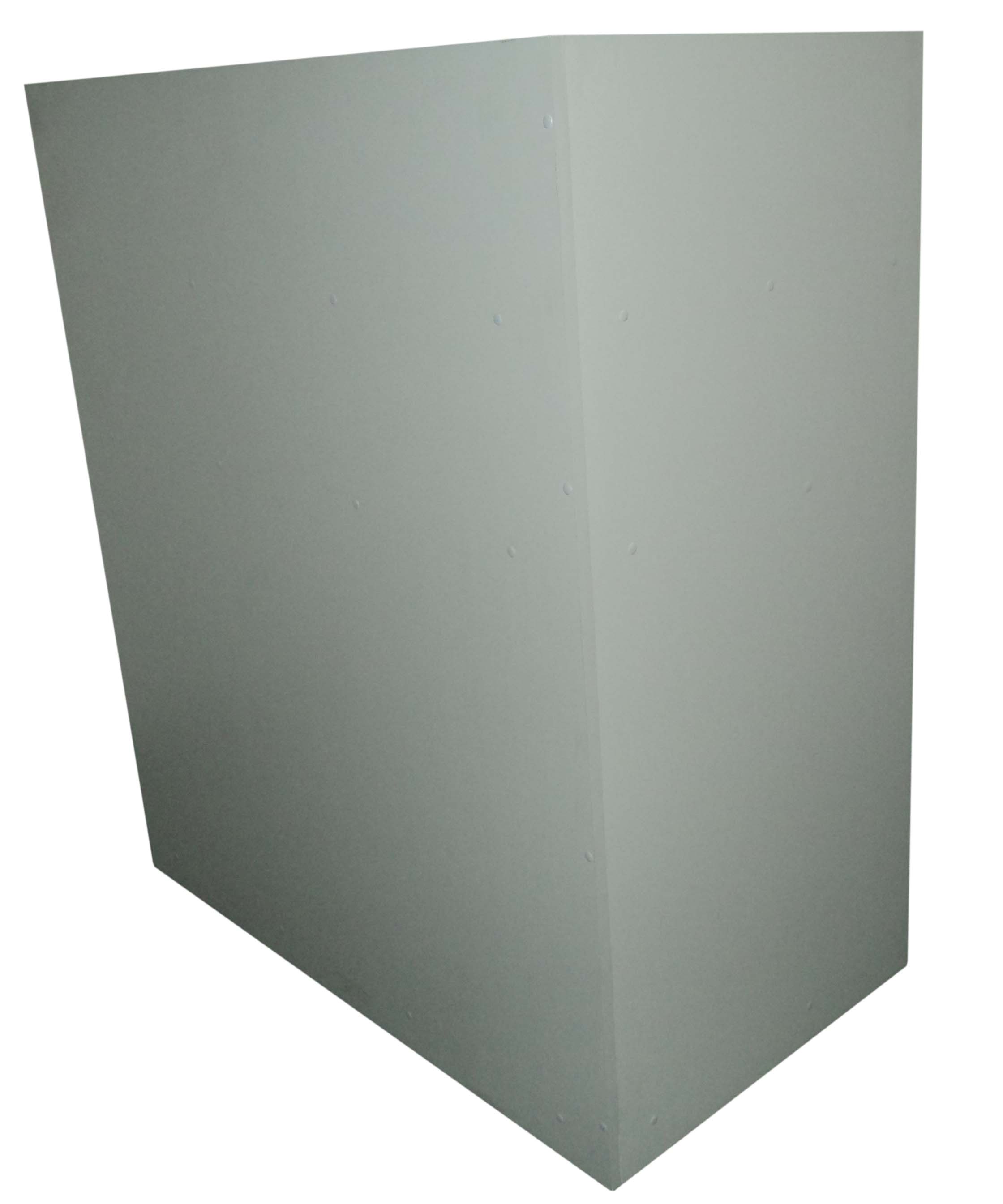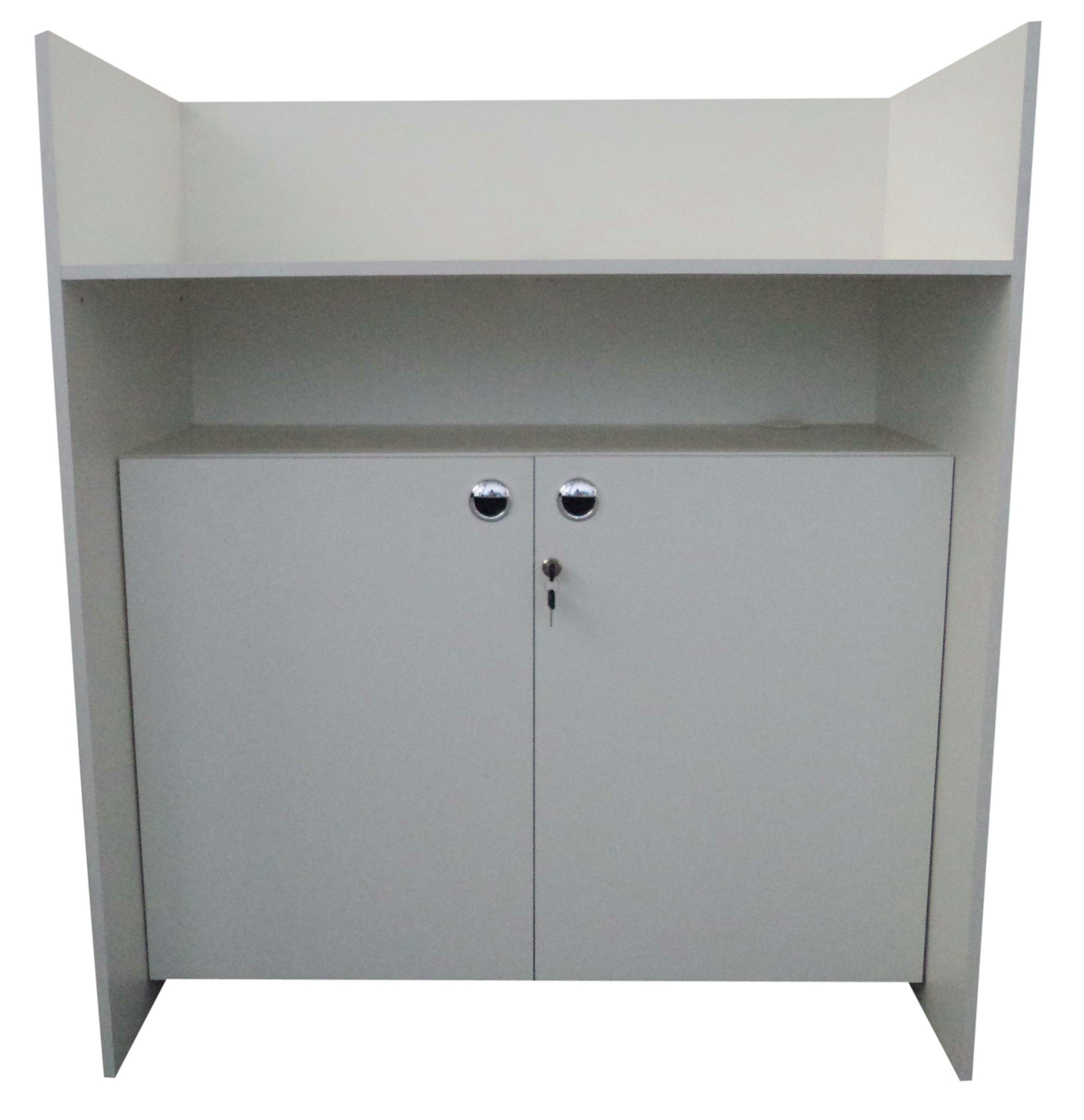 Balcão com estrutura em MDF branco. Frente lisa (pode receber adesivo). Rebaixado do lado de dentro, portas com chave e prateleiras internas.