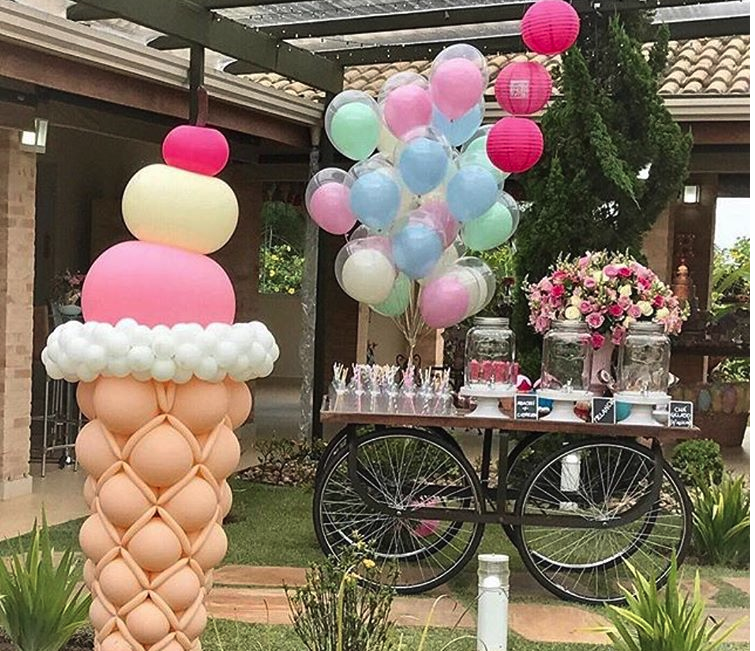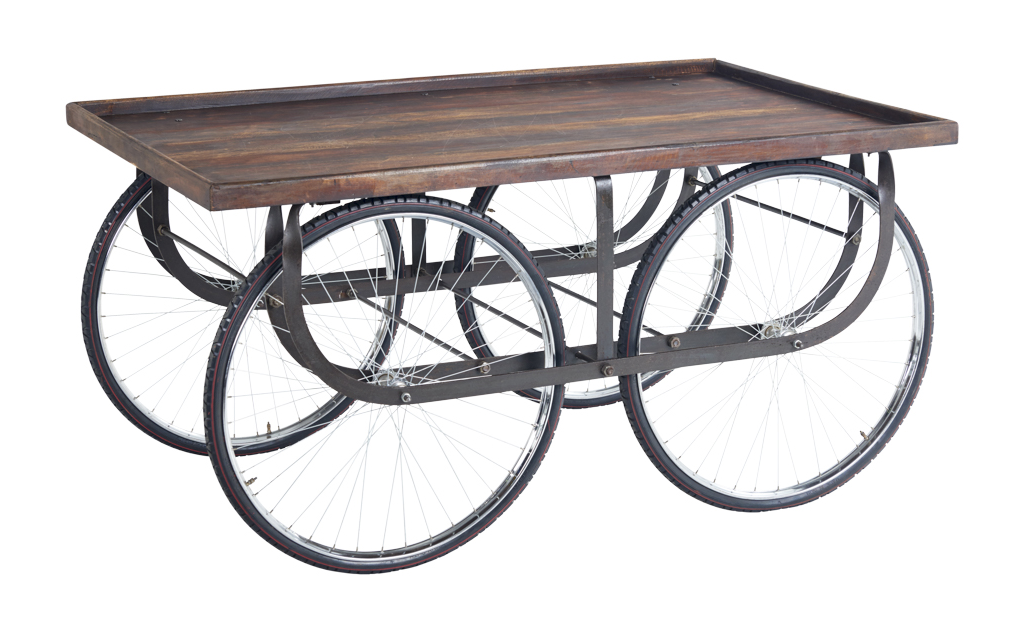 Aparador-carrinho em madeira envelhecida com rodas de bicicleta.