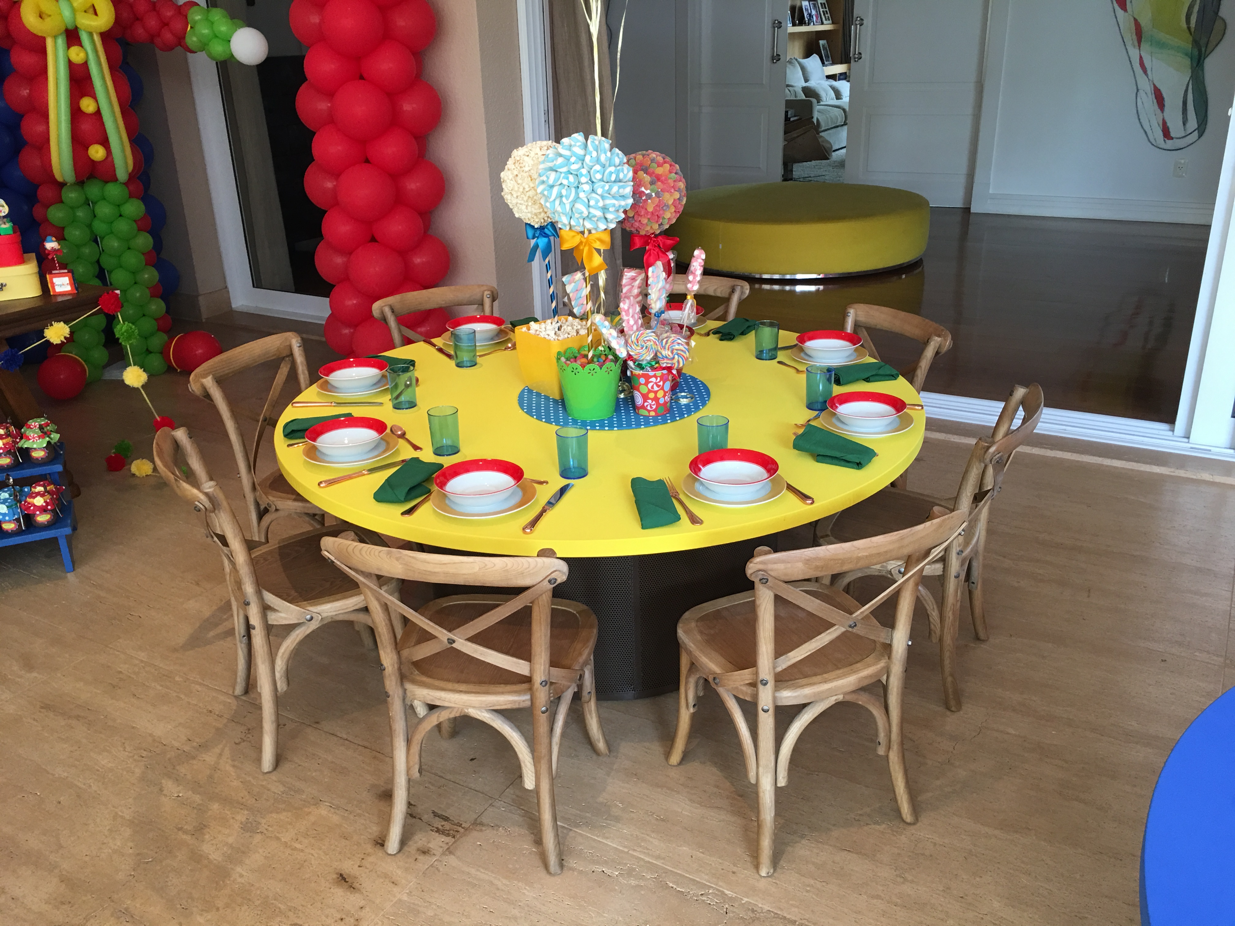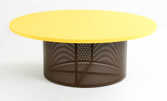 Mesa redonda com tampo colorido (consulte personalização). Nessa versão amarela.