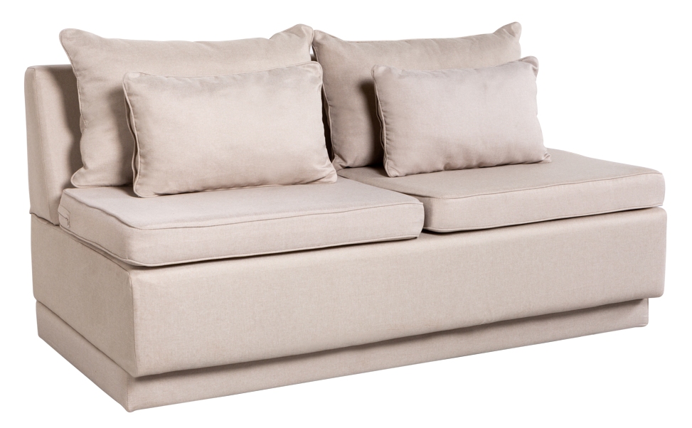 Sofá modular, adequado para ser usado com mesas, pois a altura do seu assento é a mesma de uma cadeira, estilo booth. Disponível na cor Fendi clara.