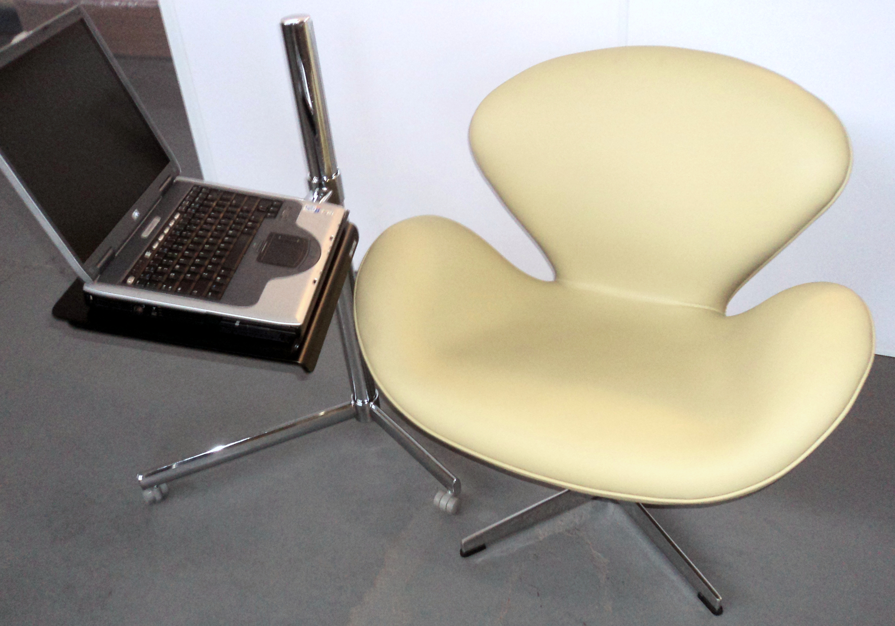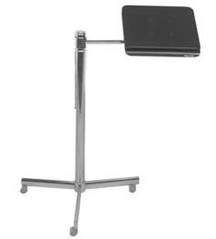 Estrutura cromada, flexível, com rodízios e suporte para laptop.