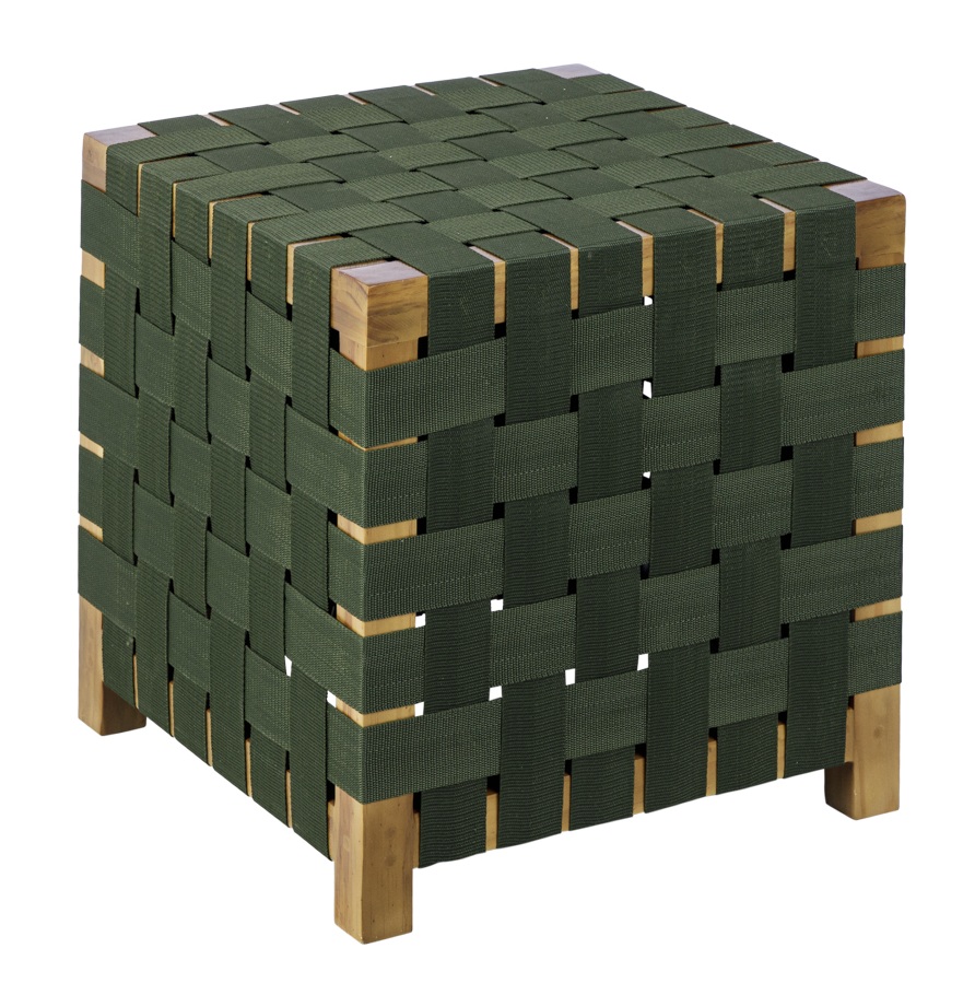 Banqueta baixa de madeira, tramada com fitas.
